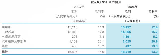奇瑞的营收增长同样隐藏着结构性问题。2022-2024年,奇瑞营收从926亿元增长至2699亿元,复合年增长率高达约71%。但这种增长速度到了2025年出现明显放缓的趋势。与此同时,奇瑞的综合毛利率持续承压。2025年上半年,奇瑞综合毛利率同比减少近两个百分点至13%,其中乘用车毛利率同比减少2.5个百分点至12.4%。这一数据明显低于同期比亚迪、长城和吉利的毛利率水平。