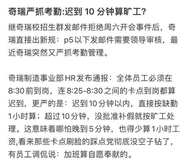 内部管理问题同样不容忽视。奇瑞多次被曝对于加班、考勤、休假等事项的管理异常严苛,并遭到公司员工的强烈抵触。据《金融界》等多家媒体报道,此前,一名00后奇瑞校招生在收到公司周六开会的邮件后,直接回复拒绝,并将邮件抄送公司高层。事件爆出后该员工获得内部上万条私信支持,奇瑞也因此取消了原定周六进行的会议。