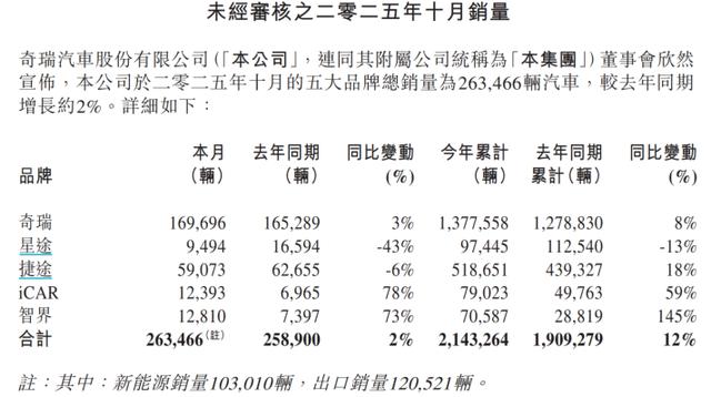 根据奇瑞上市公司披露,2025年前10月累计销量214.3万辆,同比增加12%。但细分品牌数据却揭示了更深层次的问题。