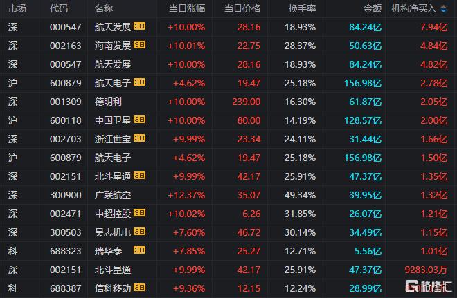 龙虎榜单日净买入额前三为航天发展、北斗星通、德明利,分别为11.41亿元、4.58亿元、3.47亿元。