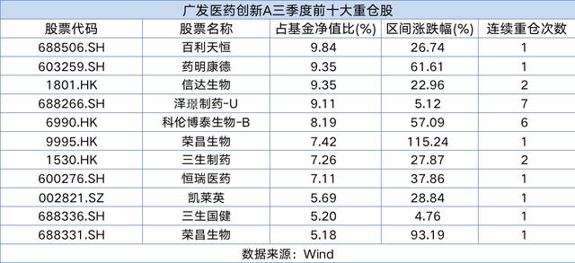 在广发沪港深医药三季度新晋的6只重仓股中,有5只涨幅超过25%。其中,荣昌生物单季度涨幅115.24%,康龙化成涨幅73.81%,体现出基金经理在深度选股方面的优势。