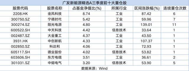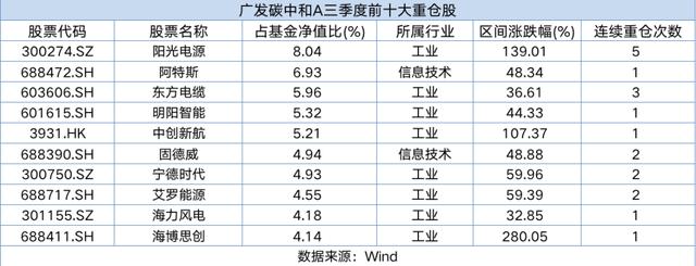 根据三季报,广发碳中和主题混合发起式A的股票仓位为85.86%,主要配置了储能和海风这两个子行业;前十大重仓股合计仓位为54.19%,包括阳光电源(8.04%)、阿特斯(6.93%)、东方电缆(5.96%)、明阳智能(5.32%)等。