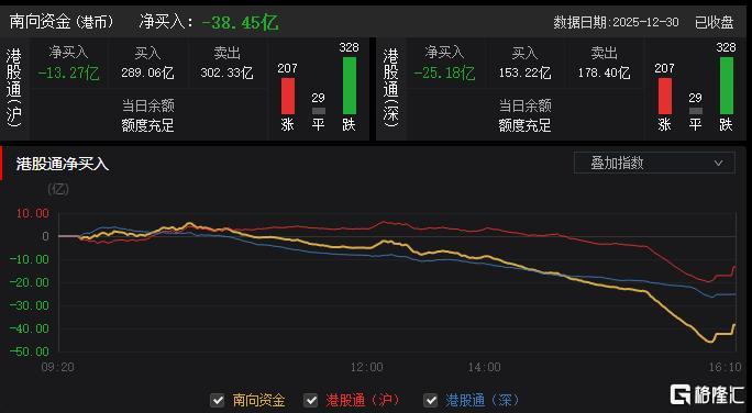 今日,南向资金净卖出38.45亿港元,其中港股通(沪)净卖出13.27亿港元,港股通(深)净卖出25.18亿港元。