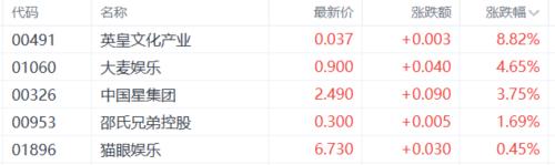 影视娱乐股活跃,英皇文化产业涨近9%,大麦娱乐、中国星集团、邵氏兄弟控股、猫眼娱乐等跟涨。