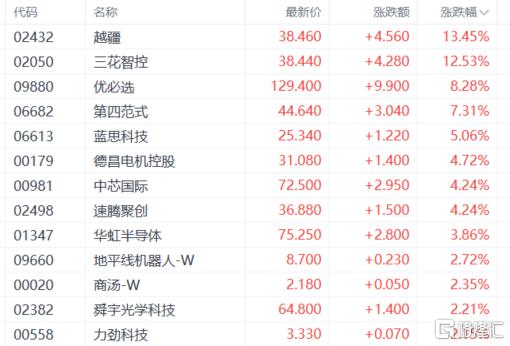 机器人概念股走强,三花智控涨超12%,优必选、第四范式、蓝思科技、德昌电机控股等跟涨。