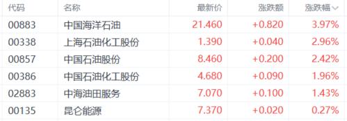 石油股走强,中国海洋石油涨近4%,中国石油股份、中国石油化工股份、中海油田服务、昆仑能源等跟涨。