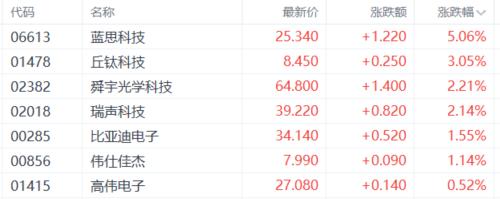苹果概念股上涨,蓝思科技涨超5%,丘钛科技、舜宇光学科技、瑞声科技、比亚迪电子等跟涨。