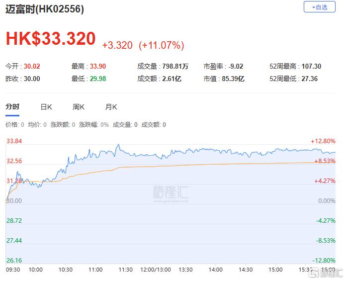 AI应用企业迈富时今日大幅拉升,涨超11%报33.32港元,总市值85.39亿港元。