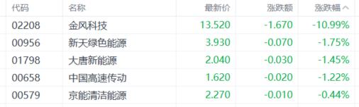 另一方面,风电股大肆走低,龙头金风科技大跌近11%;核电股、航空股、建材水泥股、电池股、保险股、濠赌股表现弱势。