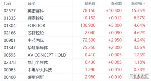 半导体股拉升,英诺赛科涨超15%,顺泰控股、芯智控股、中芯国际、华虹半导体等跟涨。