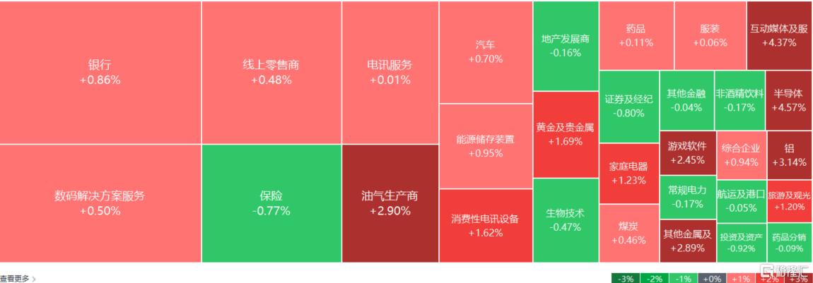 盘面上,权重科技股集体上涨,百度劲升近9%表现十分抢眼,网易、小米涨超2%,京东、腾讯、阿里巴巴、美团皆上涨;半导体股拉升走强,英诺赛科大涨超15%领衔上涨,权重中芯国际涨超4%;地缘政治风险再度升温促国际油价大涨,“三桶油”走高,中海油涨近4%;机器人概念股走强,三花智控涨超12%;影视娱乐股活跃,英皇文化产业涨近9%;苹果概念、有色金属、重型机械、游戏软件等上涨。