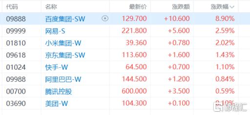 权重科技股集体上涨,百度涨近9%,网易、小米涨超2%,京东、快手、阿里巴巴、腾讯控股、美团跟涨。