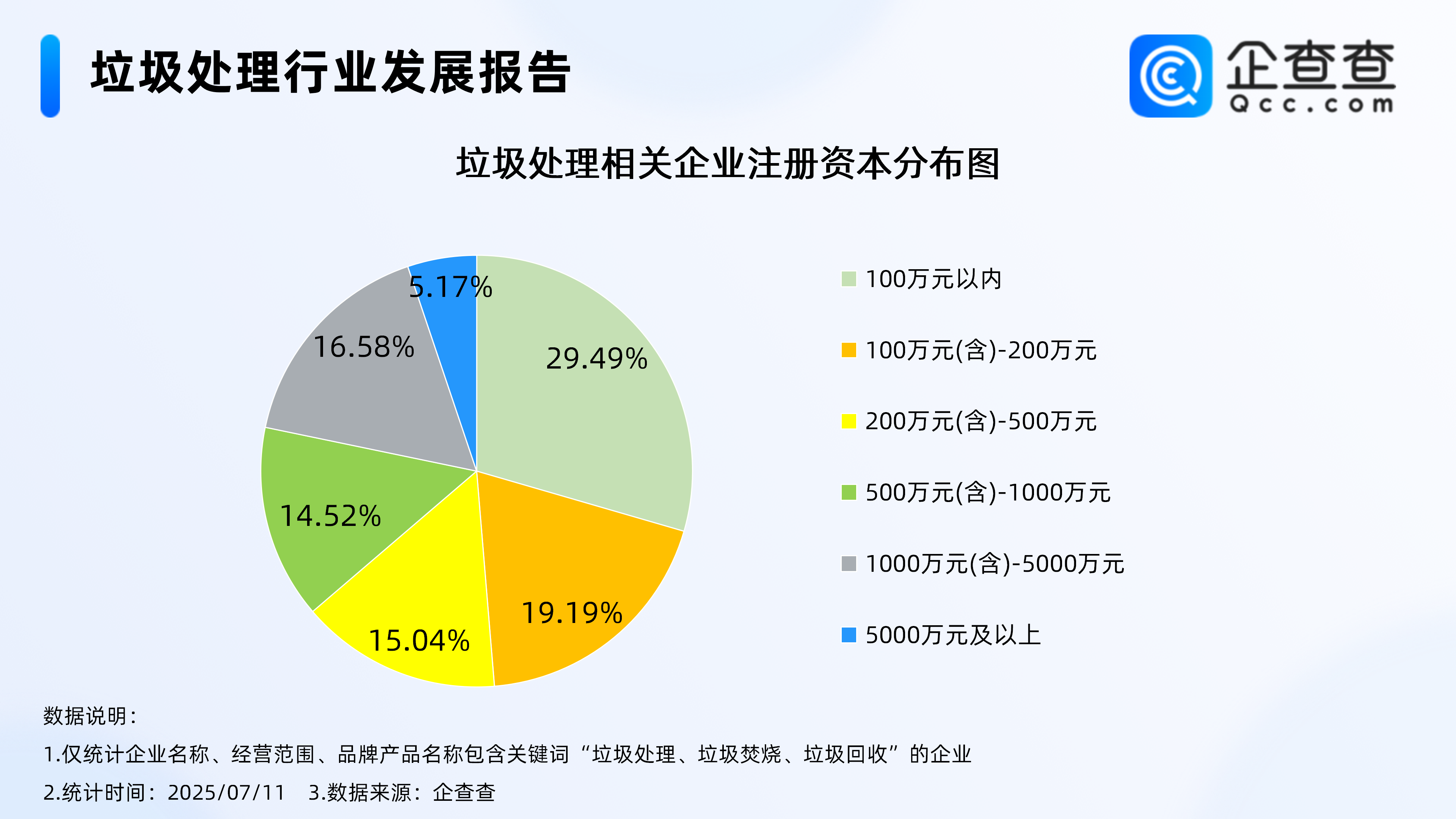 企查查数据显示,从注册资本来看,国内垃圾处理相关现存企业中,注册资本在100万元以内的相关企业最多,占比29.49%。其次,注册资本在100万元(含)-200万元、1000万元(含)-5000万元的相关企业分别占比19.19%、16.58%。