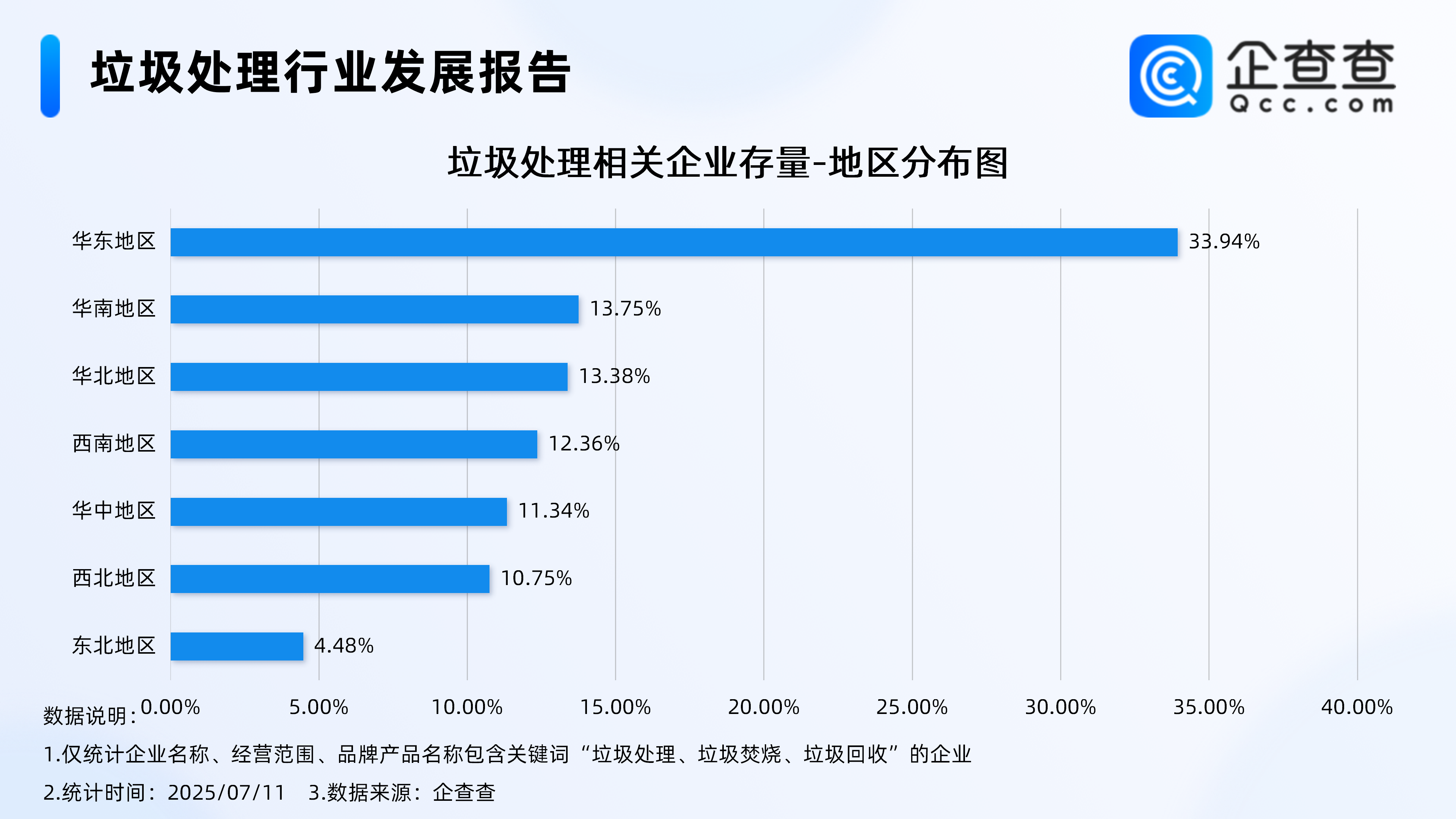 企查查数据显示,从地区分布来看,垃圾处理相关现存企业主要集中在华东地区,占比33.94%。其次,分布在华南地区、华北地区的相关企业分别占比13.75%、13.38%。