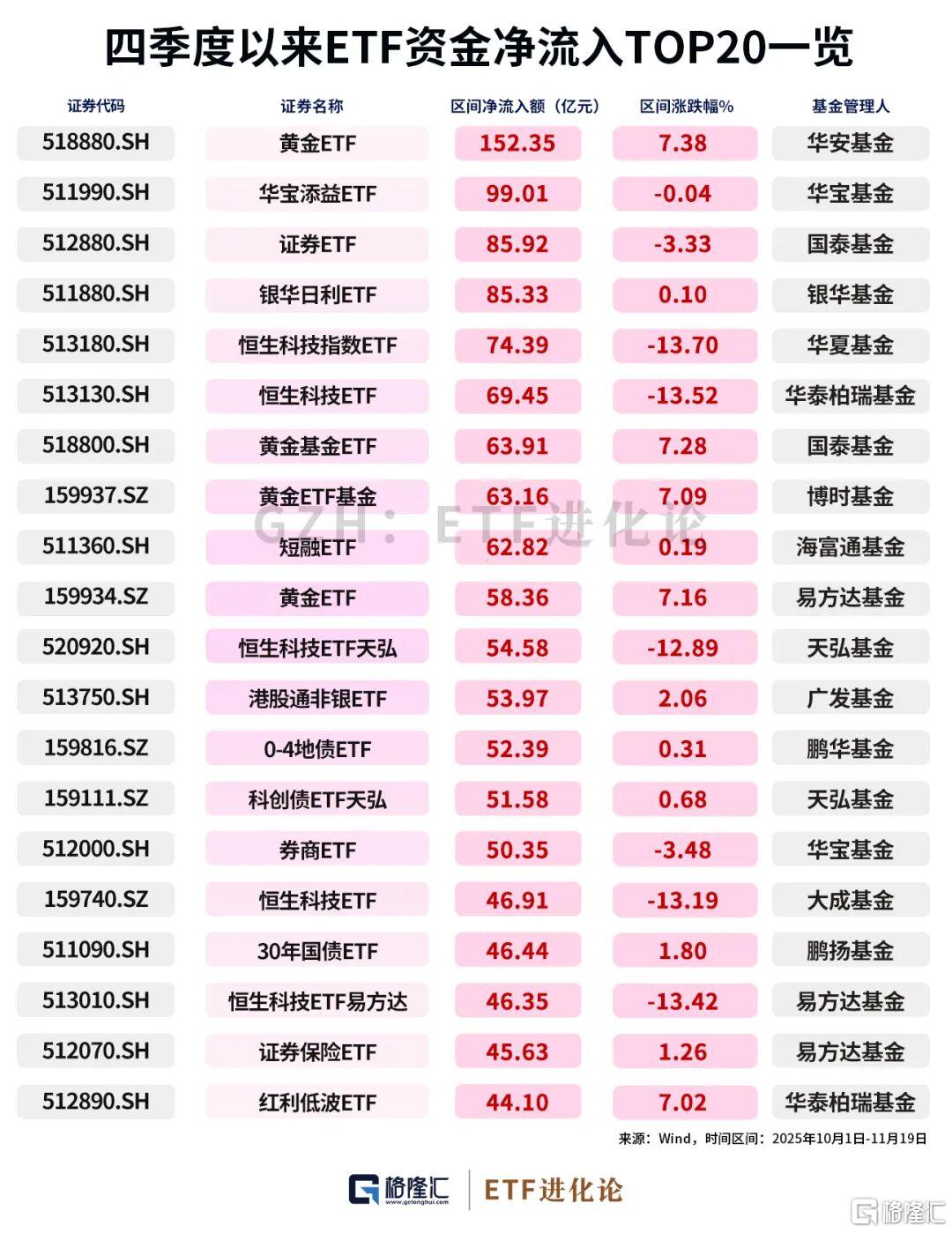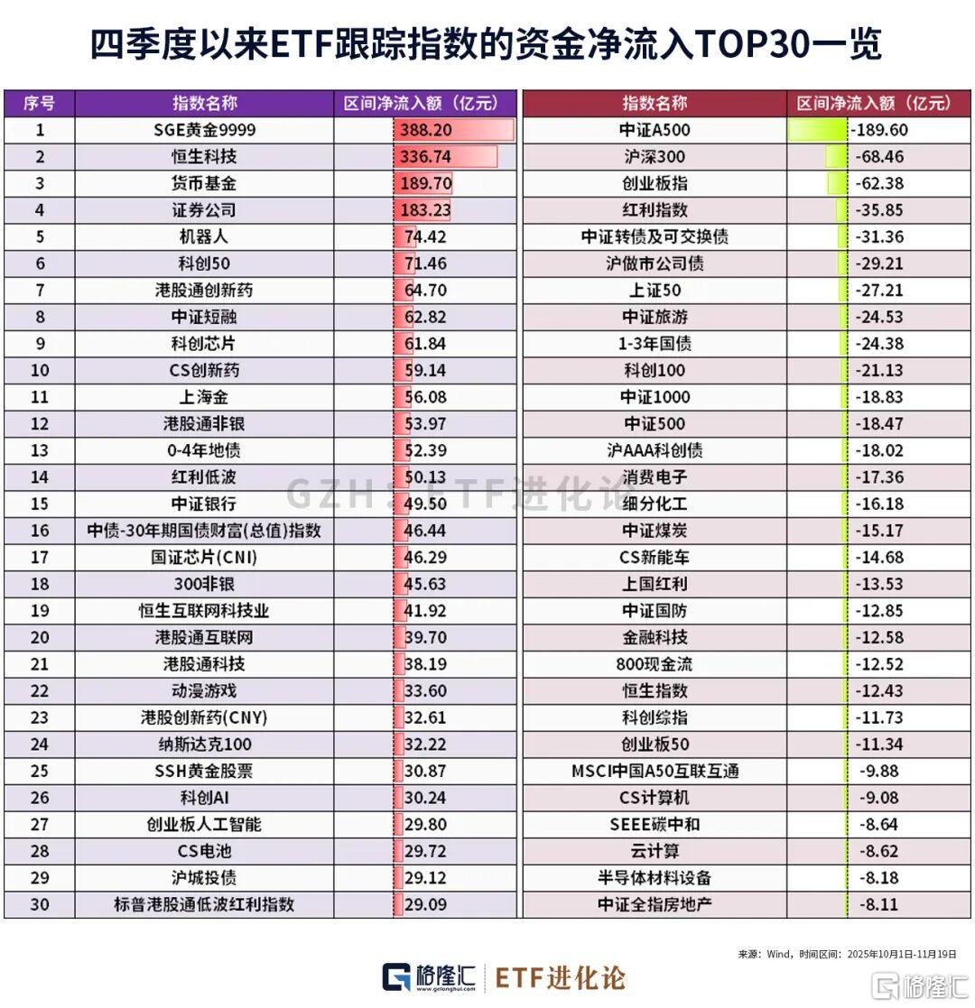 华安黄金ETF、国泰证券ETF、华夏恒生科技指数ETF四季度以来“吸金”居前。