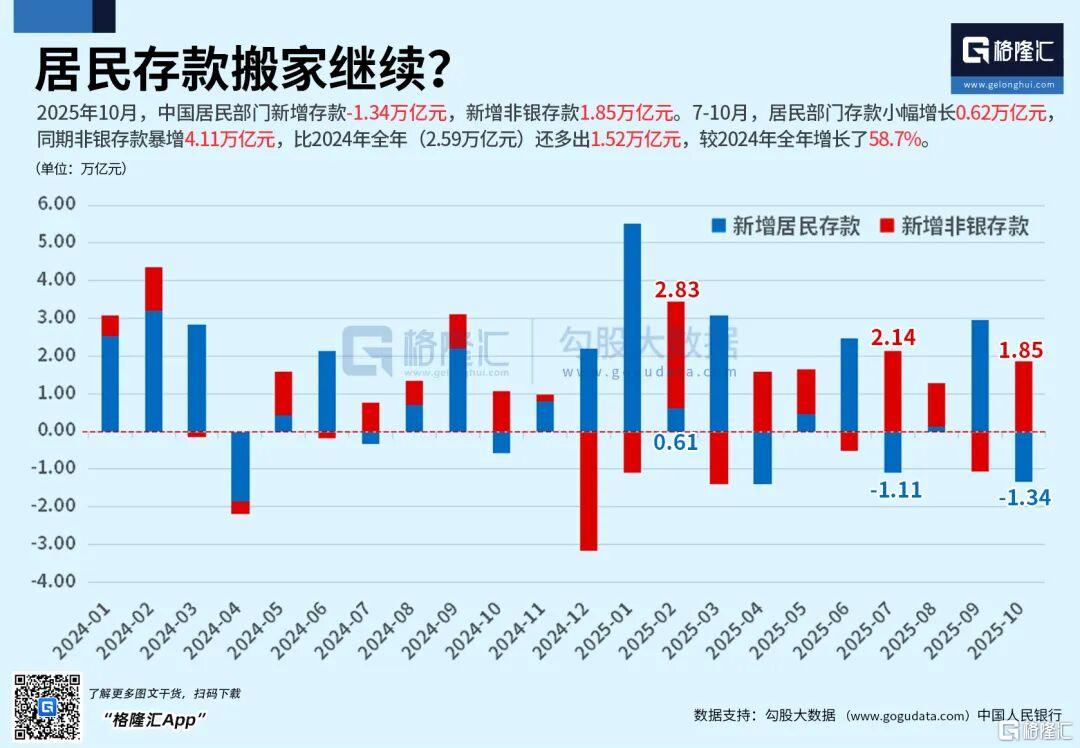 从存款搬家角度来看,10月,中国居民部门新增存款减少1.34万亿元,新增非银存款1.85万亿元,7-10月,居民部门存款小幅增长0.62万亿元,同期非银存款暴增4.11万亿元。