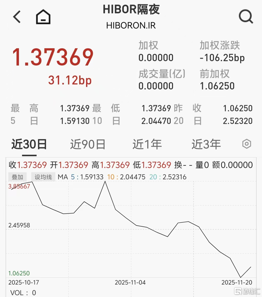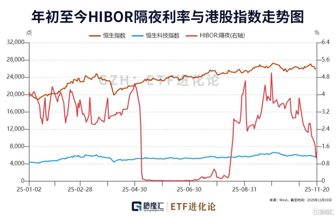 需要留意的一点是,Hibor隔夜利率水平从10月30日以来持续走低,从3.85%的水平到骤降至目前的1.37%。