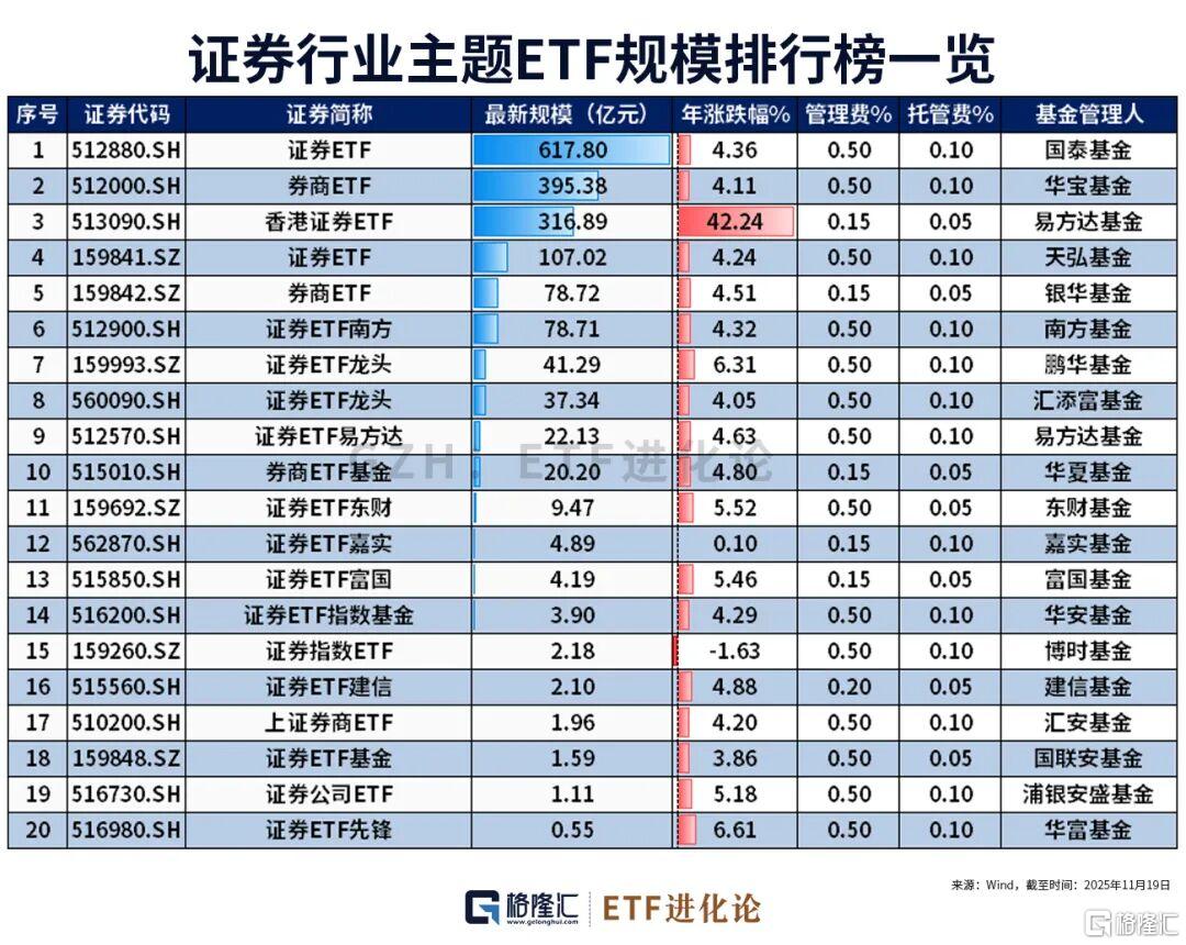 国泰证券ETF、华宝券商ETF和易方达香港证券ETF的规模居前三。