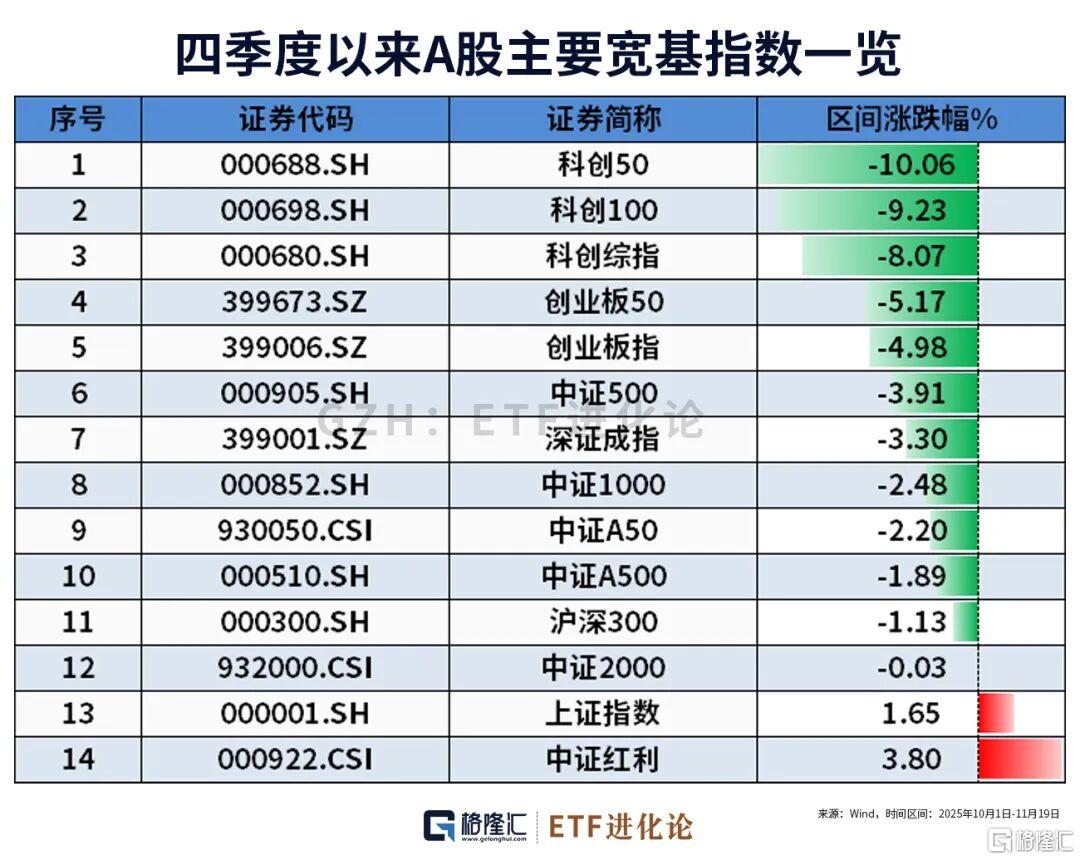 进一步统计A股主要宽基指数10月以来的表现发现:仅上证指数、中证红利指数收红,其余均下跌,科创50指数跌幅更是高达10%。