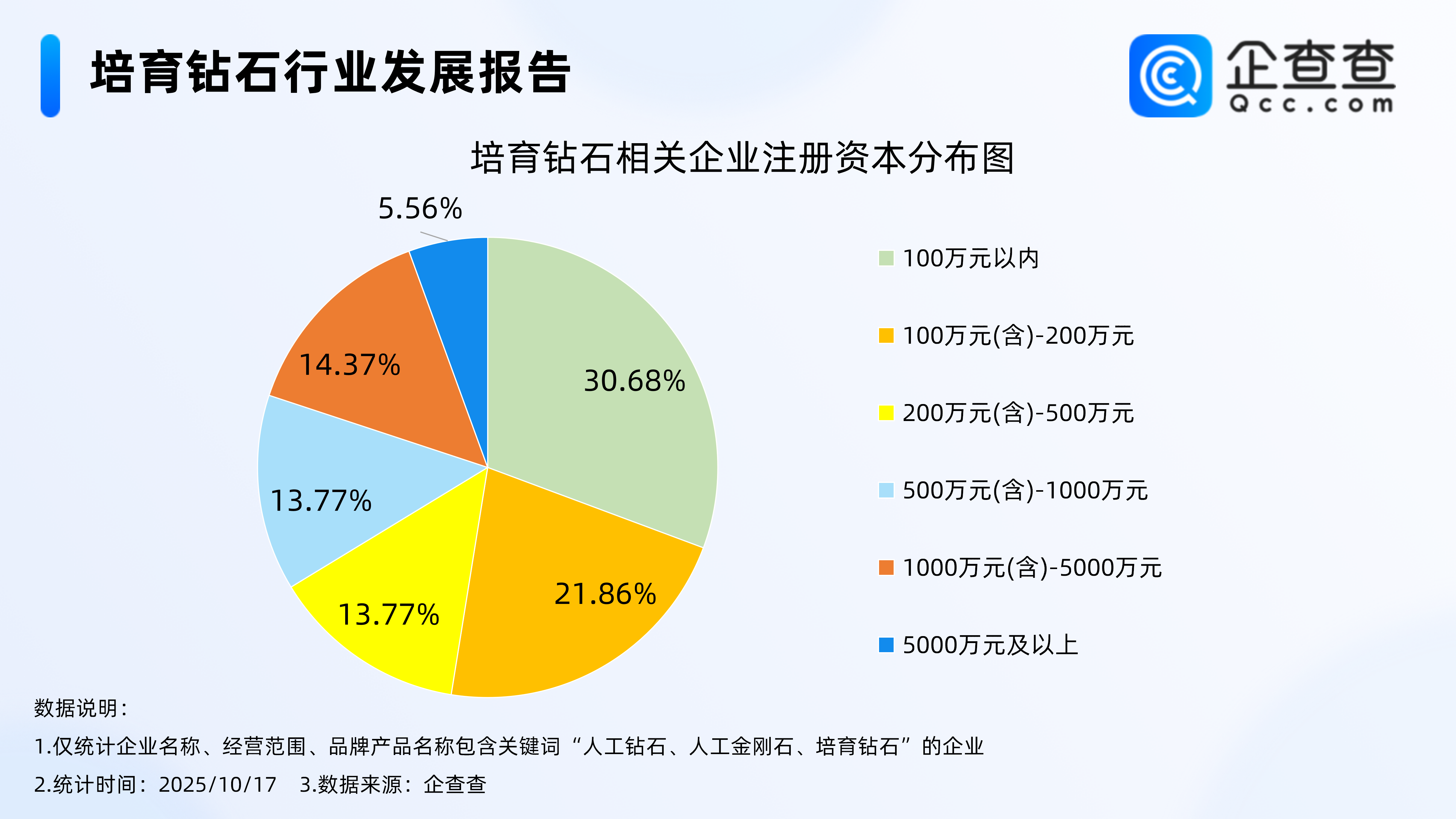 企查查数据显示,从注册资本来看,培育钻石相关企业多为轻量级企业,注册资本在100万元以内的相关企业最多,占比30.68%。其次,注册资本在100万元(含)-200万元的相关企业占比21.86%。