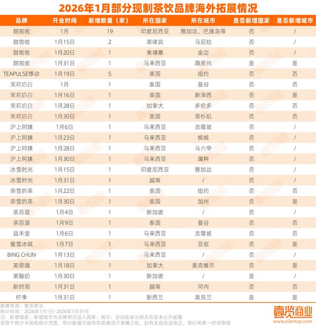 壹览商业数据显示,2026年1月,共有14个现制茶饮品牌在海外开设了49家新店。