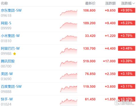 截至收盘,恒生科技指数强势涨超3%,恒指涨1.72%,国指涨超2%。
