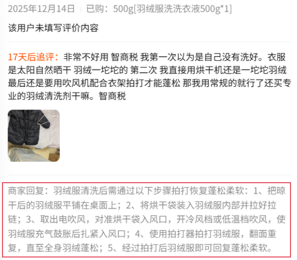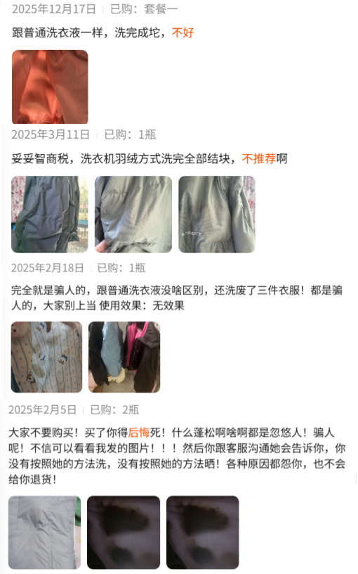 ▲部分消费者评论(图源:某羽绒服专用洗涤剂评论区)