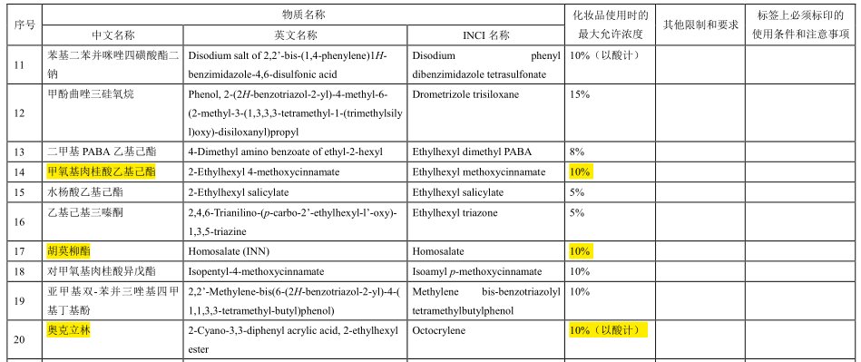 而中国内地允许上述成分在化妆品中使用。据《化妆品安全技术规范(2015年版)》,EHMC、胡莫柳酯、奥克立林允许使用的最高浓度皆为10%。