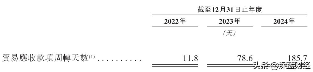 据此计算,海辰储能2024年的贸易应收款项占其总收入的比例高达69.5%,这也意味着该公司收入金额中有近七成将被用作赊账。同时,海辰储能的应收账款周转天数也由2022年的11.8天延长至2024年的185.7天,回款风险高企。