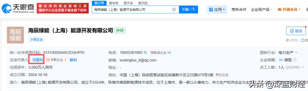 天眼查信息显示,冯登科现任海辰绿能(上海)能源开发有限公司法定代表人,该公司大股东为海辰储能,持股90%。