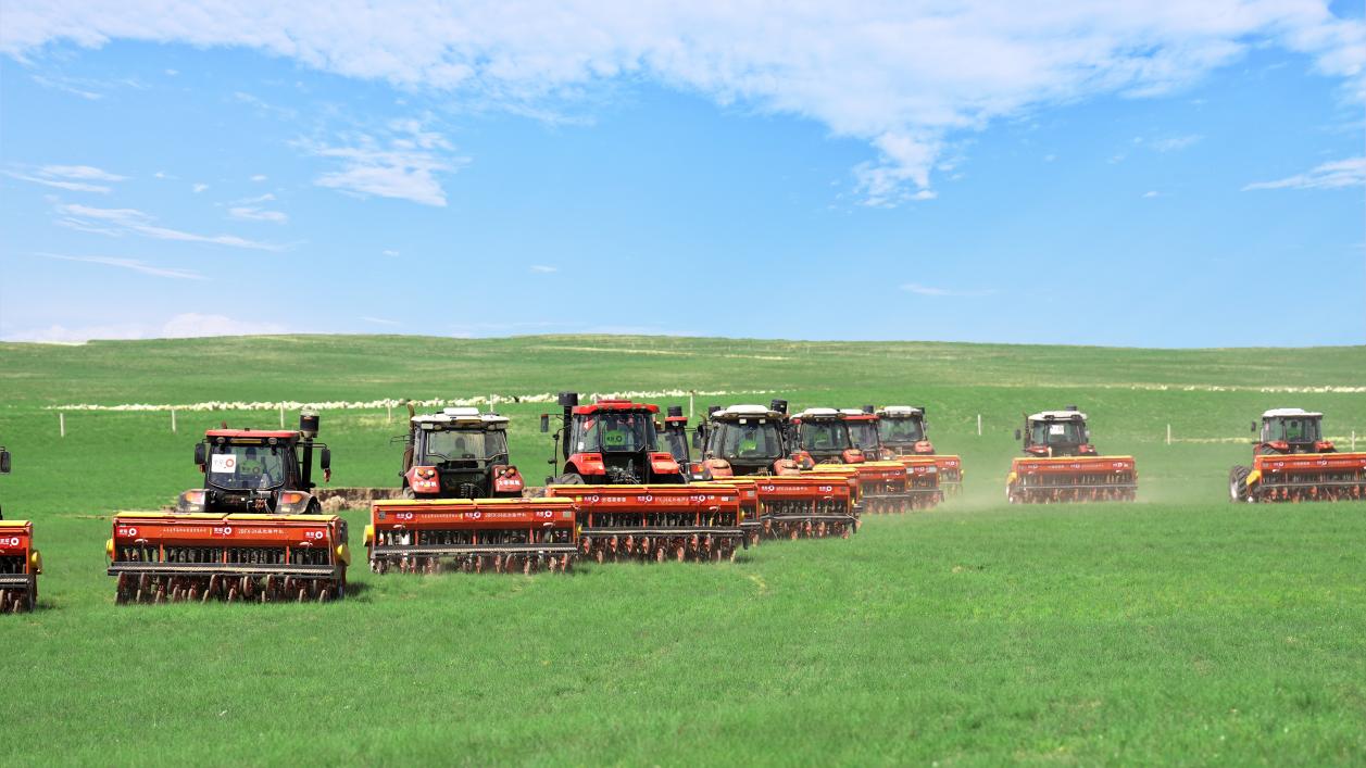 草原免耕补播机正在作业,规模化机械队是打赢“三北”工程攻坚战的可靠支撑