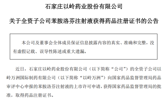 与此同时,以岭药业也同步发布公告称,其全资子公司以岭万洲国际制药有限公司首个自主研发的化药新药万舒安®(苯胺洛芬注射液)获国家药监局批准上市。