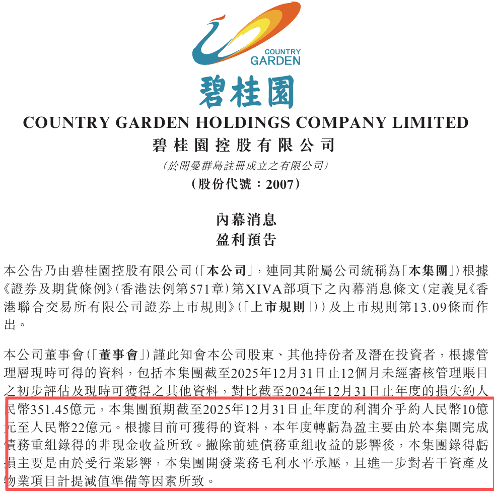 债务压力下,碧桂园2025年的盈利预告显得尤为特别。