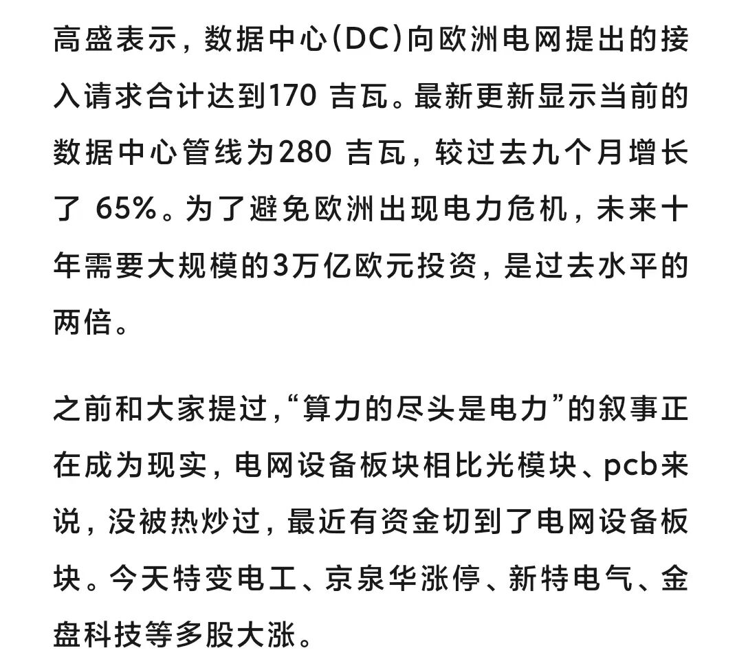之前多次和大家强调“算力的尽头是电力”的叙事正在成为现实,很多机构也开始在推“北美缺电”的逻辑,今天A股电网设备板块掀起涨停潮,双杰电气、金冠电气、中能电气、三变科技、特变电工等十数只个股涨停。