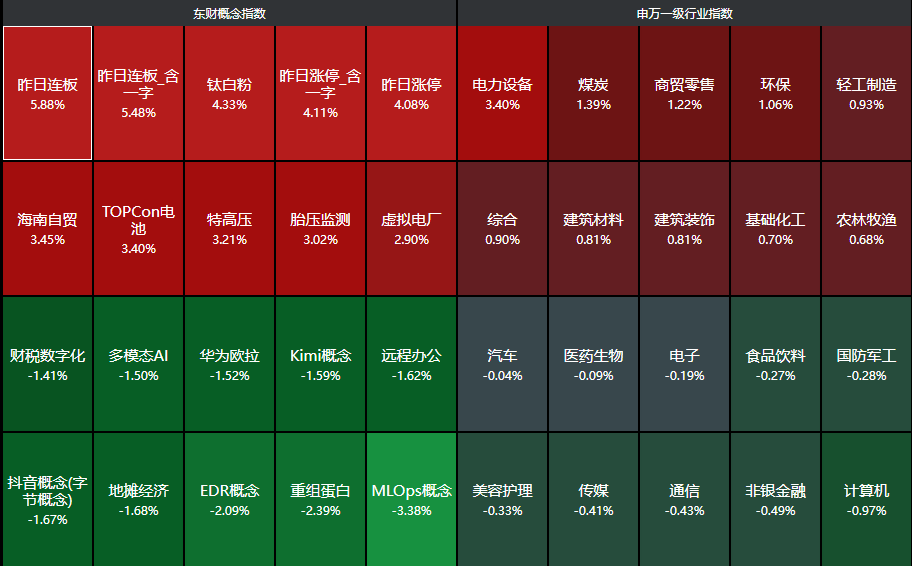 分行业来看,电力设备、煤炭、商贸零售、环保、轻工制造等行业领涨,计算机、非银金融、通信、传媒等行业领跌。