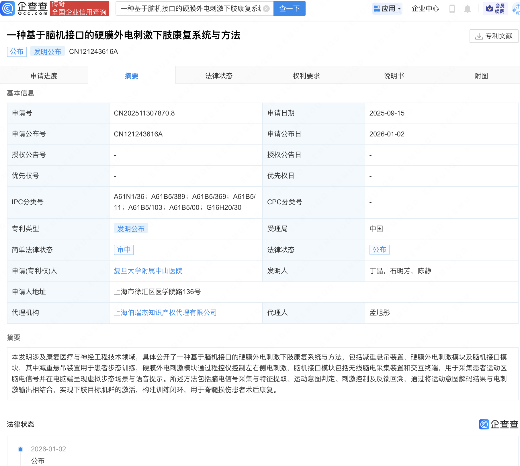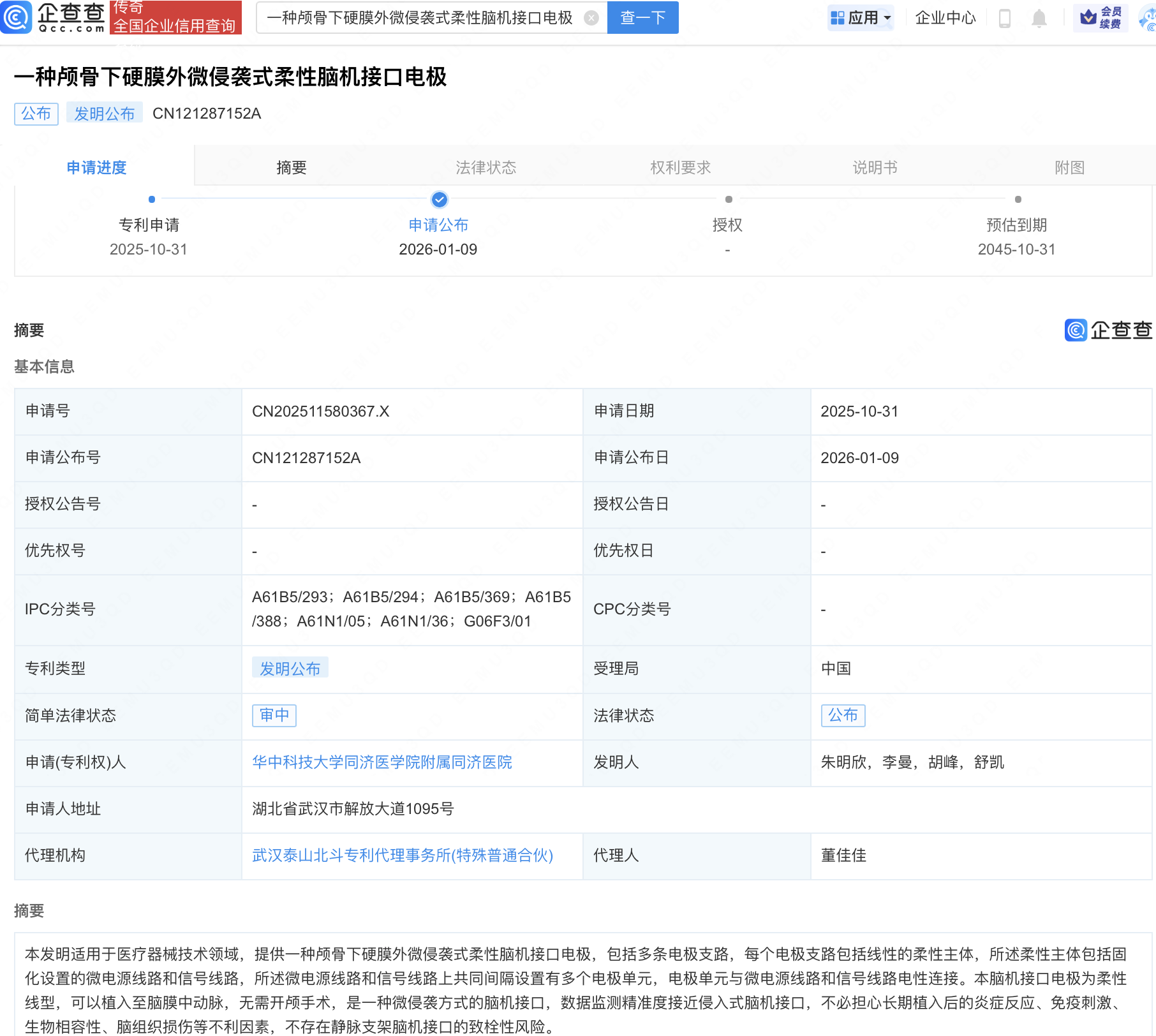 据悉,四川明确脑机接口医疗服务价格,置入费最高6583元/次。企查查APP显示,近期,成都、武汉、上海、北京等多地医院公开脑机接口专利。其中,四川省医学科学院·四川省人民医院“一种用于圆弧形脑机接口电池的固态电解质膜的制备方法”专利可满足不同脑机接口场景需求;华中科技大学同济医学院附属同济医院“一种颅骨下硬膜外微侵袭式柔性脑机接口电极”专利中脑机接口电极为柔性线型,可以植入至脑膜中动脉,无需开颅手术,不必担心长期植入后的炎症反应、免疫刺激、生物相容性、脑组织损伤等不利因素;复旦大学附属中山医院“一种基于脑机接口的硬膜外电刺激下肢康复系统与方法”专利可用于脊髓损伤患者术后康复;首都医科大学宣武医院“植入式脑机接口控制脊髓电刺激的患者改善效果分析方法”专利涉及医疗康复技术领域,可有效去除脑电信号中的SCS电刺激干扰、EXS电机噪声及生理噪声。