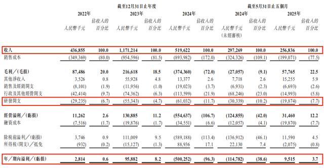 报告期内,该业务分别实现收入3.98亿元、11.27亿元、4.84亿元及2.25亿元,对总营收的贡献占比分别高达91.2%、96.2%、93.2%和87.4%。对比可见,2024年和2025年前五个月,其碳化硅外延片收入是下滑的,同比增速分别为-57.02%、-23.28%。