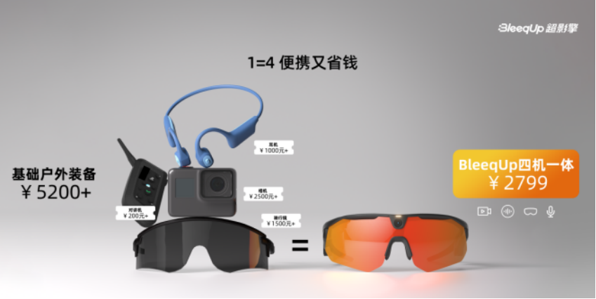 除通用型AR设备外,面向垂直场景的深度定制产品成为新亮点。BleeqUp发布的Ranger(超影擎)四合一AI运动拍摄眼镜,集成AI高清运动相机、开放式蓝牙耳机、实时对讲及专业运动护目镜功能,搭载AI智能剪辑,一键生成运动短片。