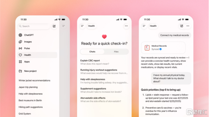 据介绍,该模式集成于ChatGPT中,是一个"专门用于与ChatGPT进行健康相关对话的独立空间",可以连接电子医疗记录和各类健康应用,能够结合用户的健康信息与个人情境生成回复。