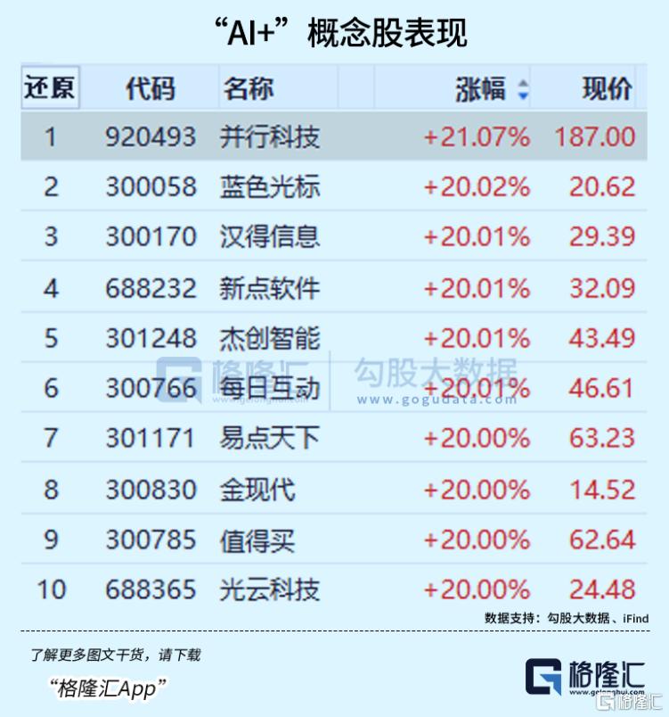 AI应用方向集体走强,易点天下20%涨停,利欧股份、浙文互联、人民网、引力传媒等多股涨停。消息面上,近期关于AI应用方向的催化频频,不同场景均有巨头争先抢滩。