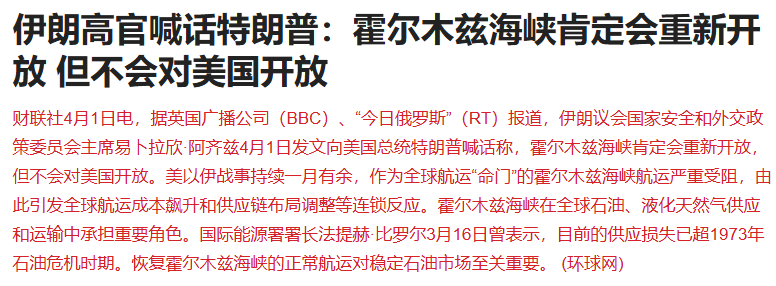 盘后有报道称,伊朗议会国家安全和外交政策委员会主席易卜拉欣·阿齐兹4月1日发文向美国总统特朗普喊话称,霍尔木兹海峡肯定会重新开放,但不会对美国开放。