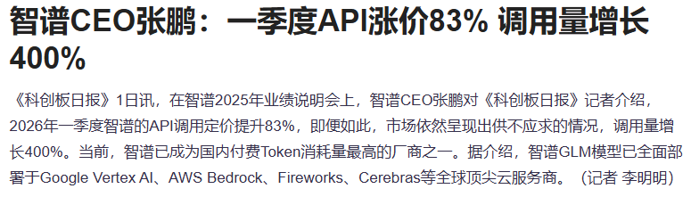 在智谱2025年业绩说明会上,智谱CEO张鹏对《科创板日报》记者介绍,2026年一季度智谱的API调用定价提升83%,即便如此,市场依然呈现出供不应求的情况,调用量增长400%。智谱涨超30%,市值突破4000亿港币,minimax涨超14%。