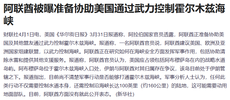 据报道,阿拉伯国家官员透露,阿联酋正准备协助美国及其他盟友通过武力控制霍尔木兹海峡。