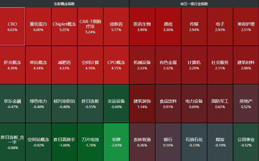 分行业来看,医药生物、通信、传媒、电子、美容护理等行业领涨,公用事业、煤炭、石油石化三大行业下跌,相当于3月份反过来了,防守板块下跌,进攻板块反弹。