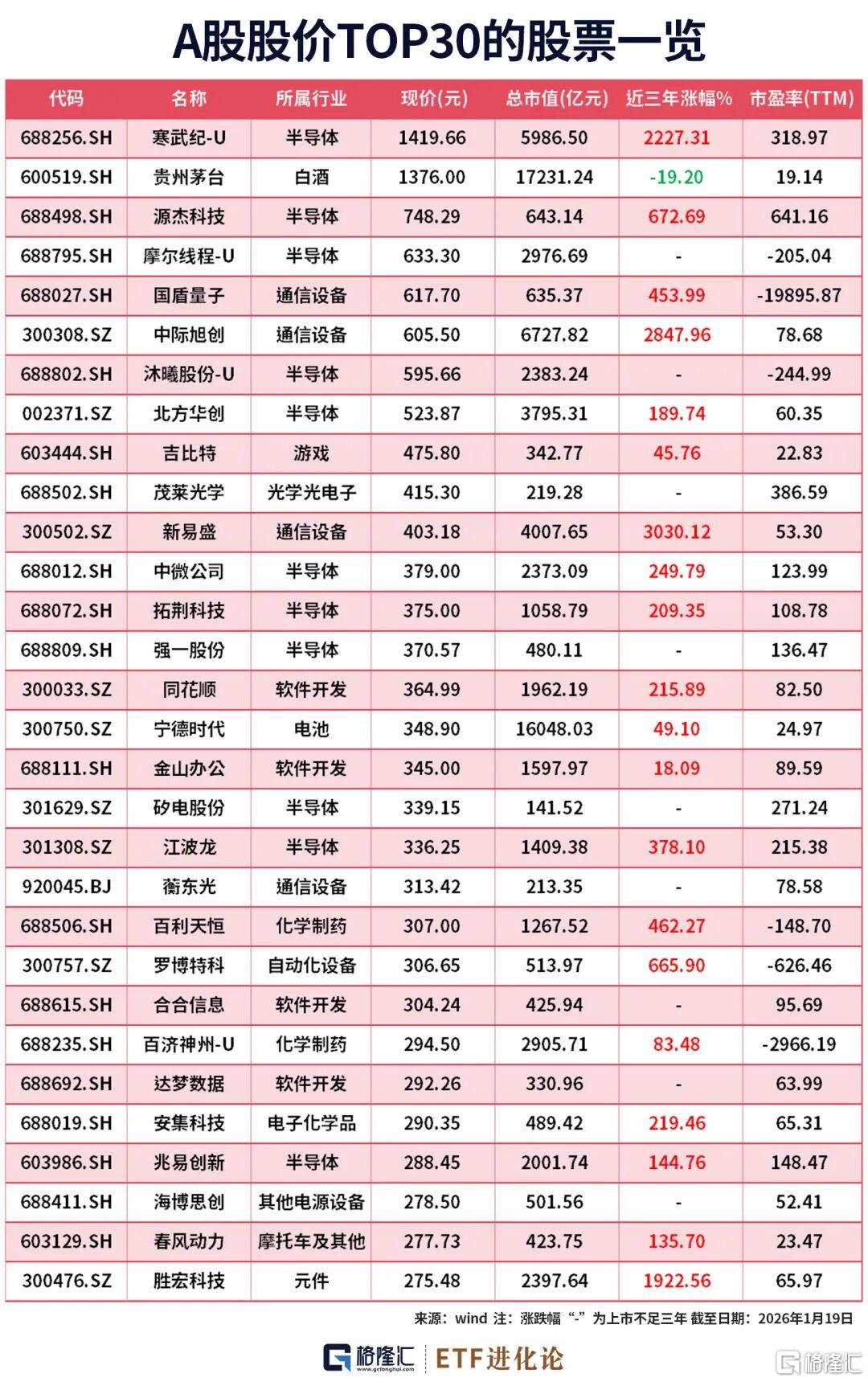 A股股价TOP30的股票中,只有贵州茅台近3年下跌。近三年以来,新易盛涨幅3030%,中际旭创涨幅2848%,寒武纪涨幅2227%,胜宏科技涨幅1922%。