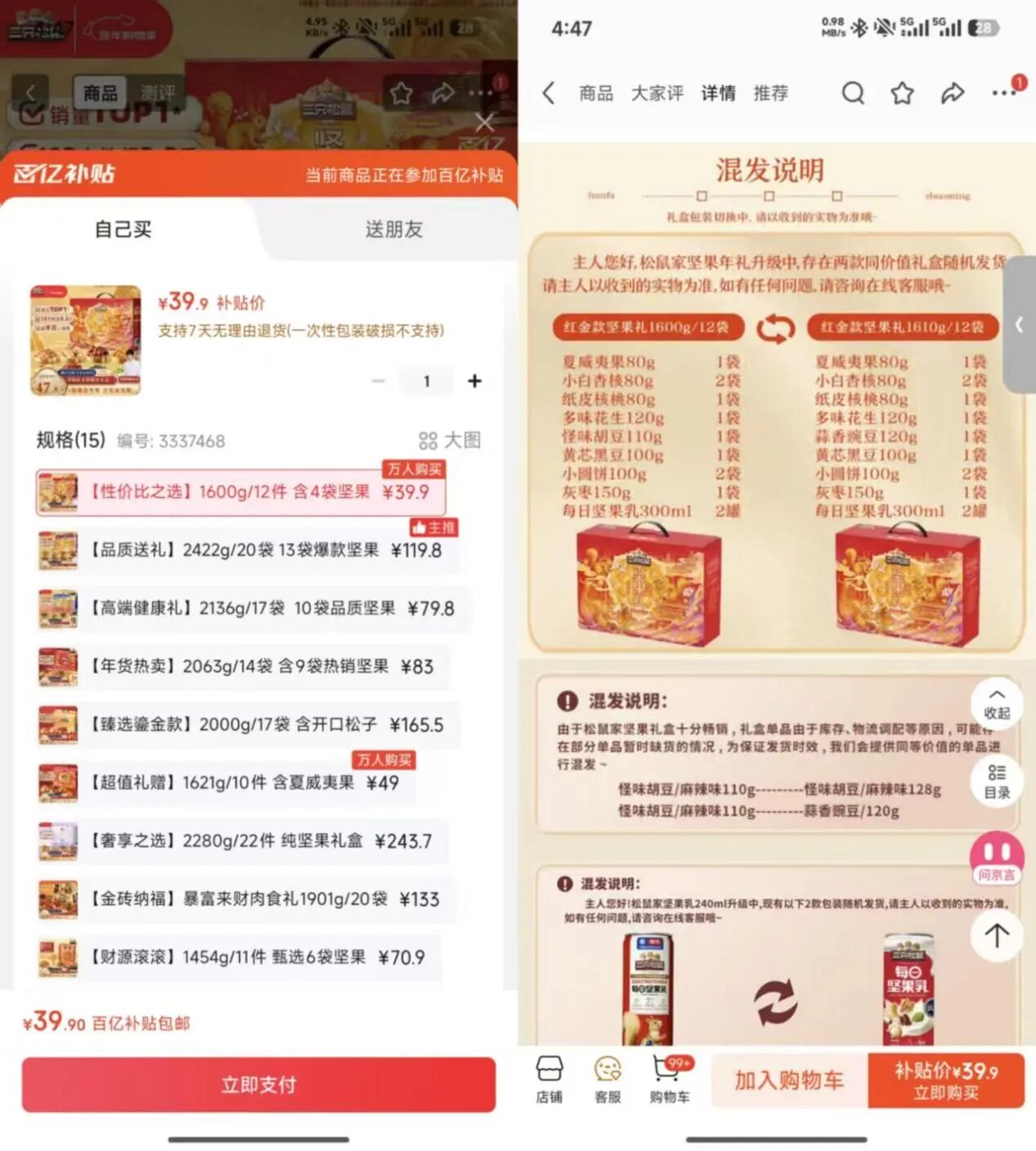 从上述产品宣传页面可以看到,标称“坚果礼盒”的中低价位产品,一般会通过饼干、点心、膨化食品、果干、饮料等大量“填充”,丰富品类和分量,同时压低成本,以迎合大众消费者的需求。