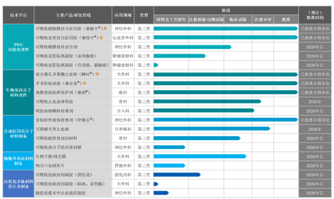 截至报告期末,赛克赛斯依托PEG功能化改性、生物基高分子材料改性等五大核心技术平台,已形成13条梯度化在研管线,覆盖神经外科、骨科、肿瘤放射科、大外科等高端赛道,已拥有25款医疗器械产品。其中,四款核心产品在细分市场具备一定的市场地位。