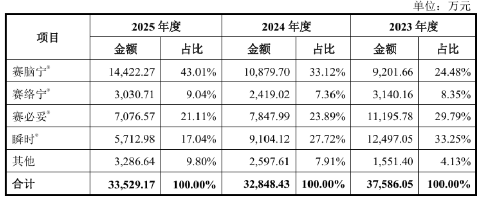 报告期内,四款产品单价均出现不同程度下滑,成为业绩承压的核心诱因。其中,赛脑宁®平均单价从1866.99元/支降至1337.59元/支,降幅28.35%;赛络宁®平均单价从1005.56元/支腰斩至509.85元/支,降幅近五成;赛必妥®平均单价从105.57元/支降至66.48元/支,降幅37.03%;瞬时®单价从178.71元/支降至119.16元/支,降幅33.32%,四款产品平均降价幅度高达37%。
