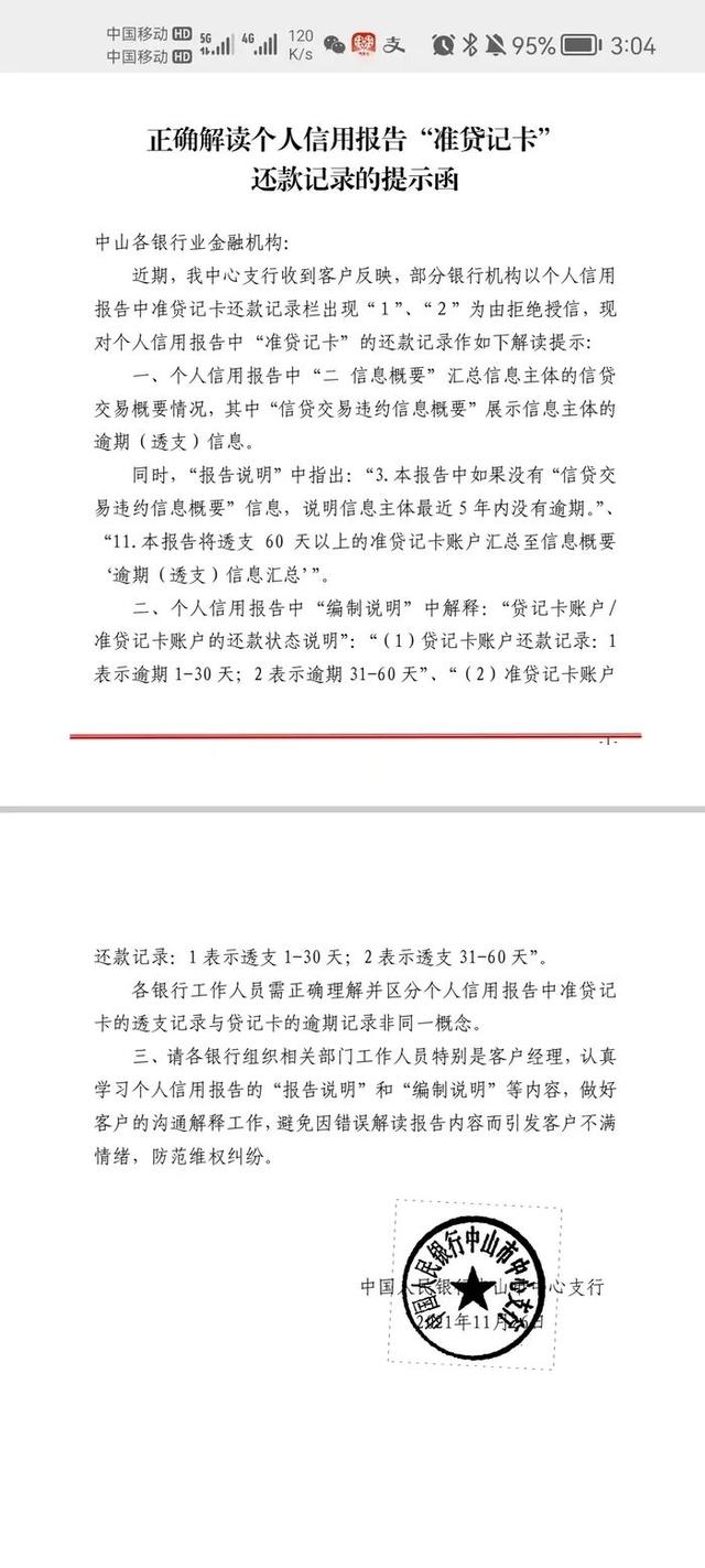 这里的关键矛盾并不在于“1”“2”两个阿拉伯数字标记的原始含义,而在于它们进入跨机构使用场景后发生的理解不一。新黄河客户端援引中国人民银行中山市中心支行出具的《正确解读个人信用报告“准贷记卡”还款记录的提示函》显示,其中明确准贷记卡还款记录“1”代表透支1-30天,“2”代表透支31-60天,并强调需要区分准贷记卡透支记录与贷记卡逾期记录的概念差异。