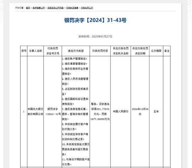 而中国人民银行官网在2025年1月27日公布的(银罚决字〔2024〕31号)显示,中国光大银行股份有限公司,因“1.违反账户管理规定;2.违反清算管理规定;3.违反反假货币业务管理规定;4.违反人民币流通管理规定;5.占压财政存款或者资金;6.违反国库科目设置和使用规定;7.违反信用信息采集、提供、查询及相关管理规定;8.未按规定履行客户身份识别义务;9.未按规定保存客户身份资料和交易记录;10.未按规定报送大额交易报告或者可疑交易报告;11.与身份不明的客户进行交易”,中国人民银行于2024年12月30日对其作出“警告,没收违法所得201.77033万元,罚款1677.06009万元”的行政处罚决定。